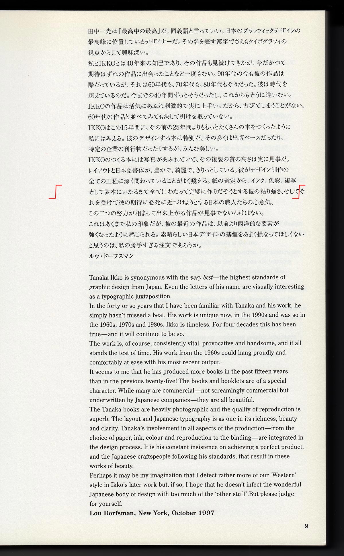 Sagen wir, er hatte nur starke Sehnsucht nach dem westlichen Satzbild, setzte seine Ideale in seinem Buch um und die japanischen Zeilen »flattern«. Bekanntlich ist Papier geduldig und über Geschmack lässt sich auch nicht streiten. Aber eines kann ich mit Sicherheit sagen, dass diese Vorgehensweise sehr fehleranfällig ist, da wirklich jede Zeile manuell umgebrochen werden muss. Ausgerechnet im Vorwort, auf der ersten Seite dieses wunderschönen Kataloges, sieht man einen fatalen Schönheitsfehler, der bedauerlicherweise übersehen wurde: